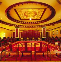 - 千古一帝餐厅----位于正安宫大堂东侧,总建筑面积883平方米。餐厅装饰尽显皇家气派:熠熠发光的四根盘龙金柱,以金黄绸缎软包的墙壁,巨大的圆形水晶灯装饰的天花造顶,以“千古一帝”四字图案为主题的大红地毯配上中式的餐桌、餐椅,特别是大厅正面墙上的巨幅国画“千古一帝”,凸显王者风范。除大厅外还有两个可容纳20人的大包间和四个可容纳10人的小包间,整个餐厅可接待260位客人同时用餐。